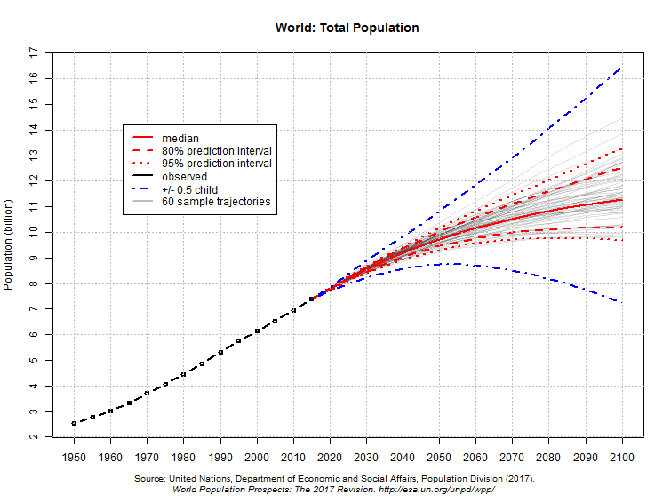 По прогнозу ООН, к 2050 году на Земле будет проживать 9,8 миллиарда, а к концу века человечество приблизится к отметке 11,2 миллиарда. Столь стремительные темпы роста во многом обусловлены высокой рождаемостью в африканских странах — к 2050 году семь из двадцати самых густонаселенных стран мира будут африканскими. К этому времени Индия обойдет Китай по количеству населения. При этом количество россиян к 2050 году, по прогнозам ООН, может снизиться до 133 миллионов человек (против 144 миллионов в 2017 году).