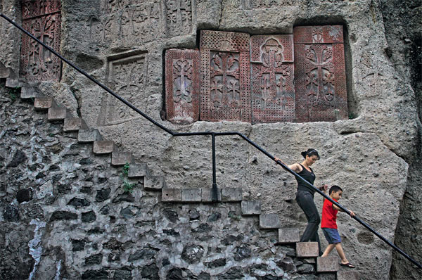 В Армении повсюду можно встретить животворящие камни — хачкары — плиты с вырезанными крестами и орнаментальными надписями. Чуть ли не в каждом селе есть отгороженное место, где под навесом установлены эти каменные святыни, хранители места, принесенные сюда с окрестных склонов. Армянский крест принципиально растительный, с корнями и кроной, древо жизни. В церквях можно встретить следы исторического лавирования: молельные ниши с исламским орнаментом и прямые кресты — «распятия крестоносцев». В Гегарде мы впервые увидели «сталактитовую» резьбу под сводами. А часть храмового комплекса там выруб лена непосредственно в скале, из расселины которой бьет ключ, благодаря чему, собственно, это место еще в дохристианские времена было выбрано для строительства святилища. В Средние века Армения наряду с Иерусалимом входила в список мест, обязательных для посещения паломниками, — не только как государство, одно из первых в мире принявшее христианство, но и как страна спасения человечества, организованного Ноем.