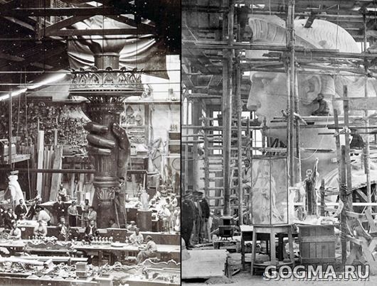 Слева: рука и факел статуи Свободы создаются в студии в Париже, 1876 год. Справа: идет создание головы статуи Свободы в парижской студии, 1880 год